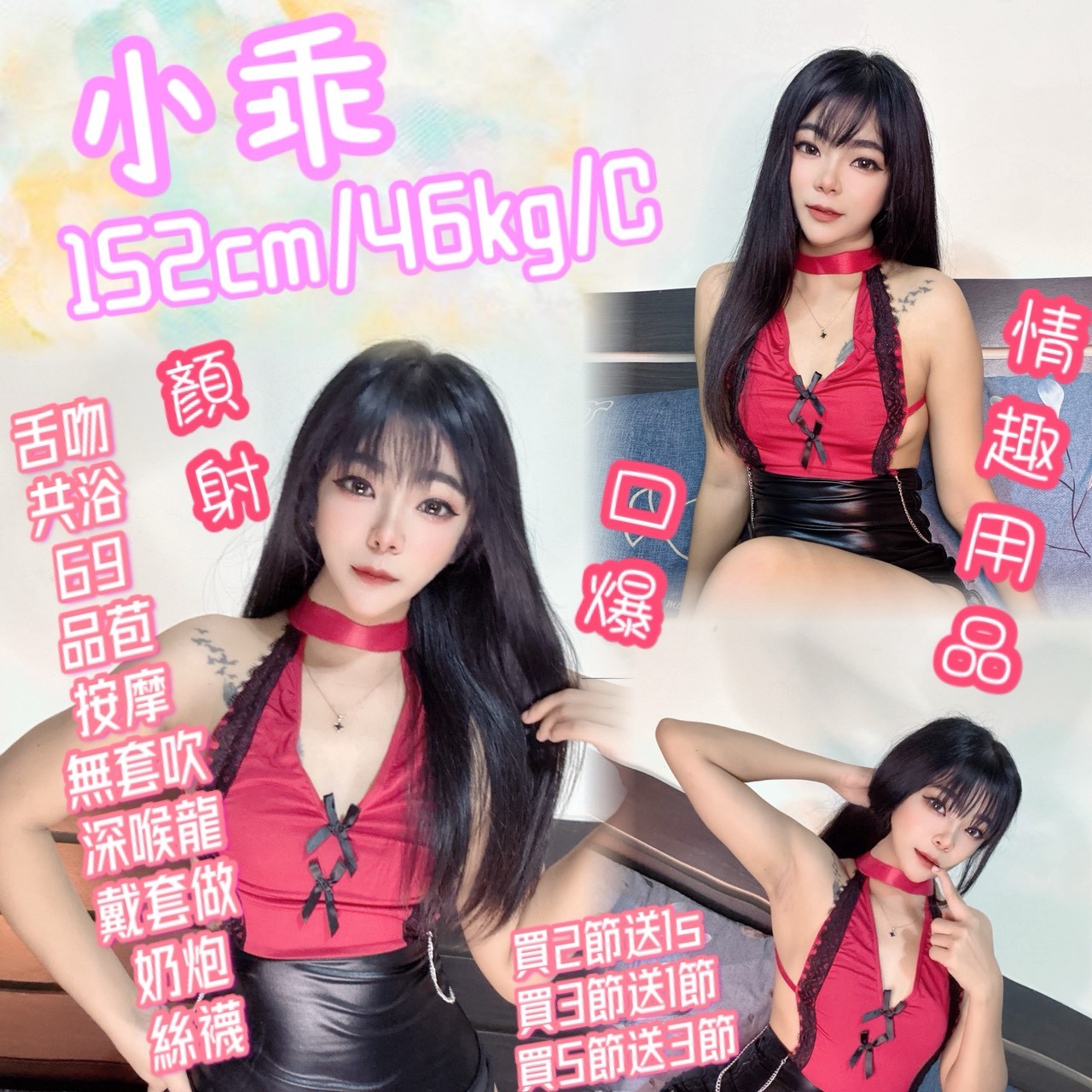 舌吻(視口腔衛生)/共浴/品鮑/69/按摩/奶炮/深喉嚨/無套吹/絲襪(客自備)
